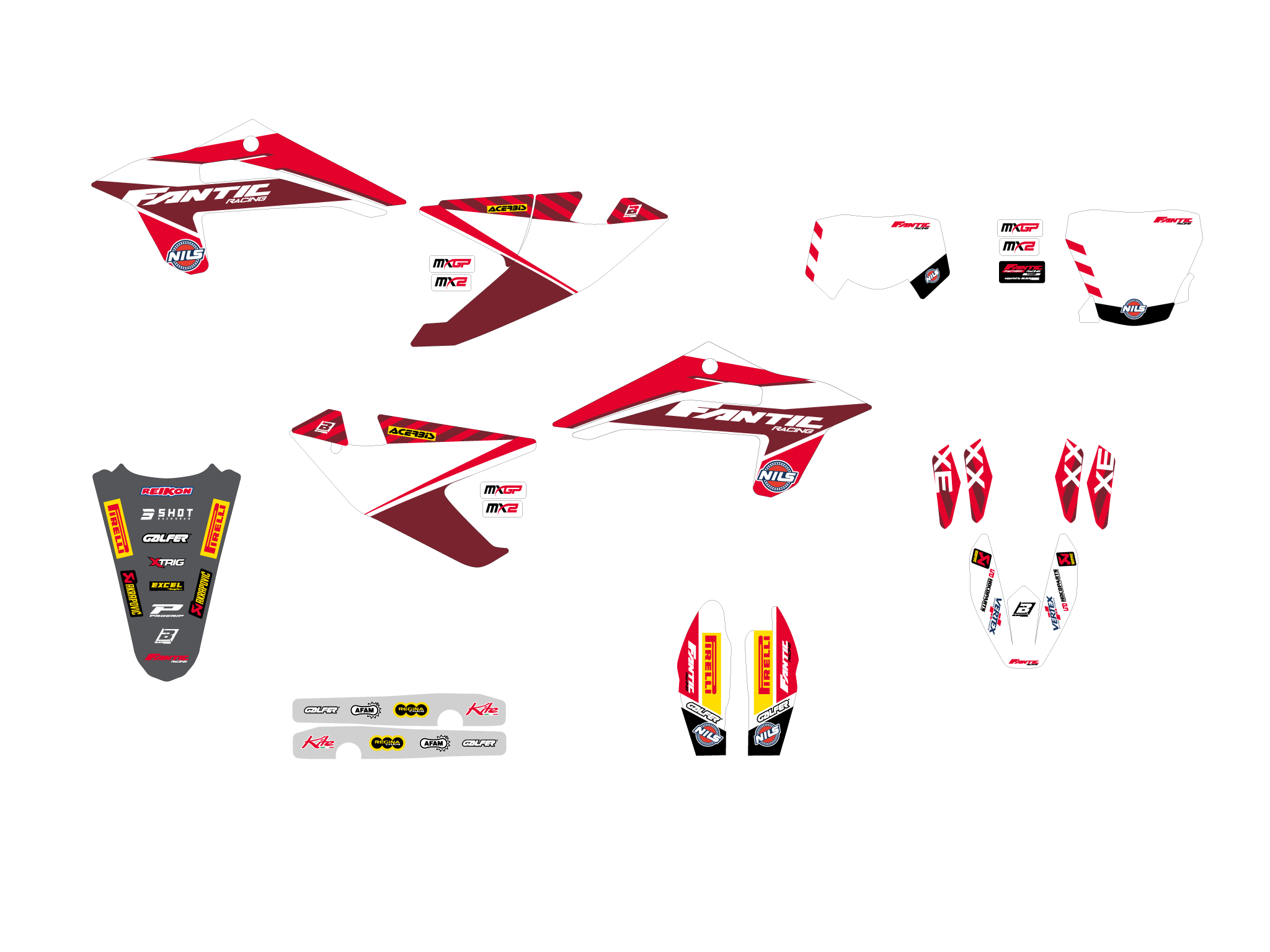 Each kit includes all the main parts: radiator shrouds, fenders, airboxes, number tables, swingarm.