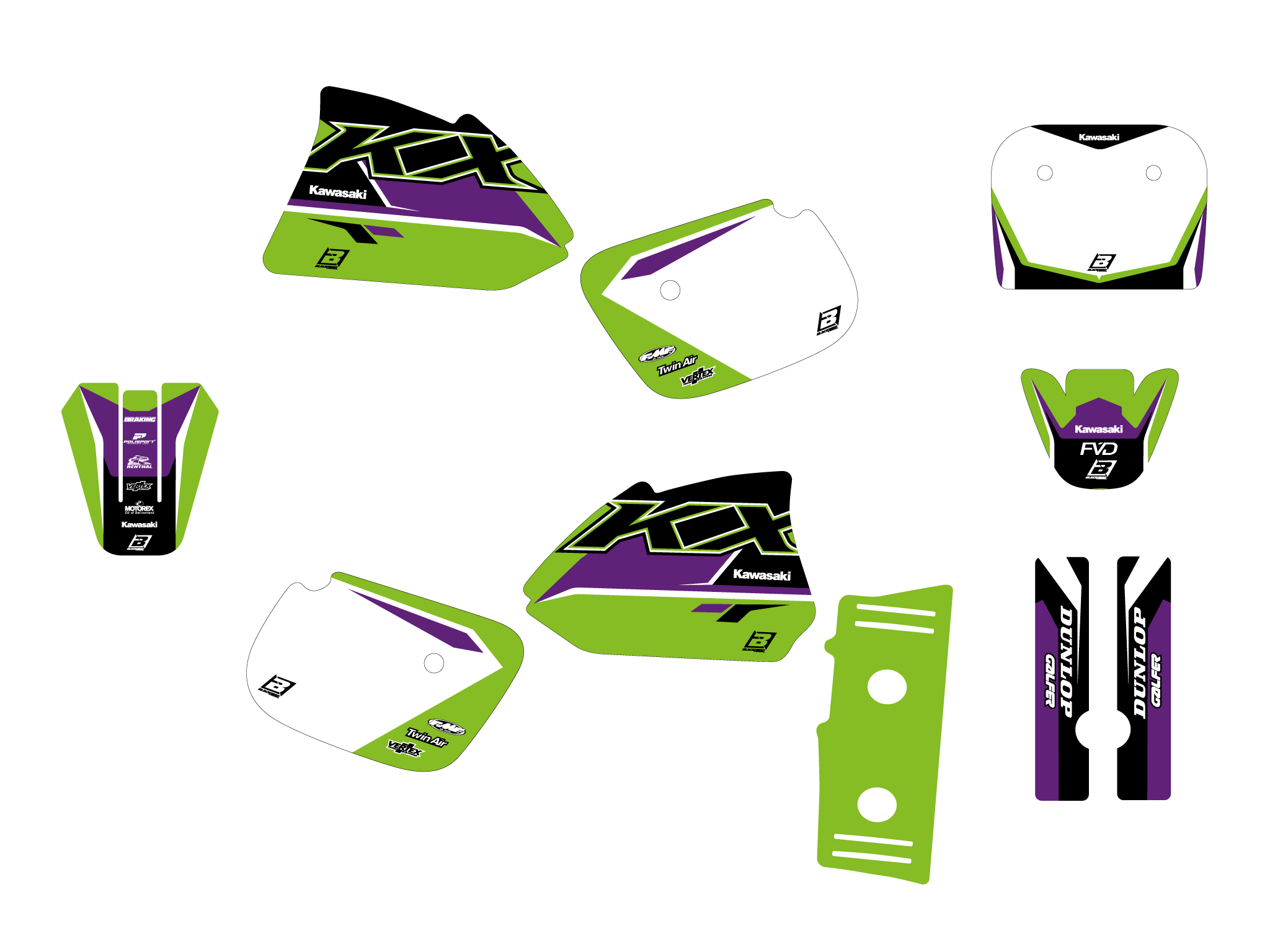 Cada kit incluye todas las partes principales: transportadores, guardabarros, airbox, tablas, basculante.