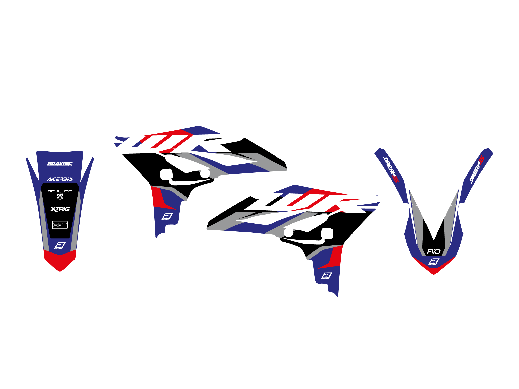 Cada kit incluye todas las partes principales: transportadores, guardabarros, airbox, tablas, basculante.