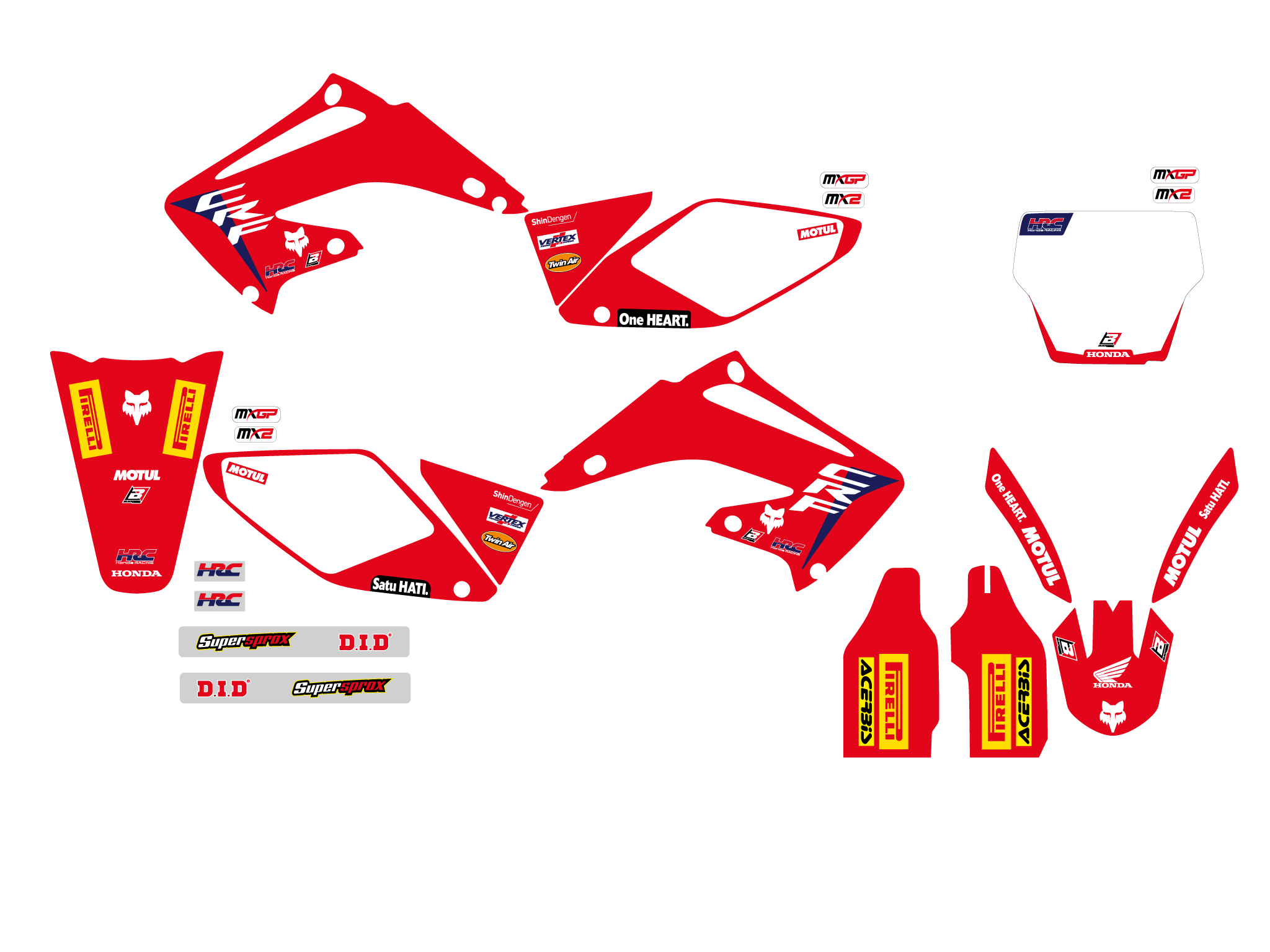 Cada kit incluye todas las partes principales: transportadores, guardabarros, airbox, tablas, basculante.