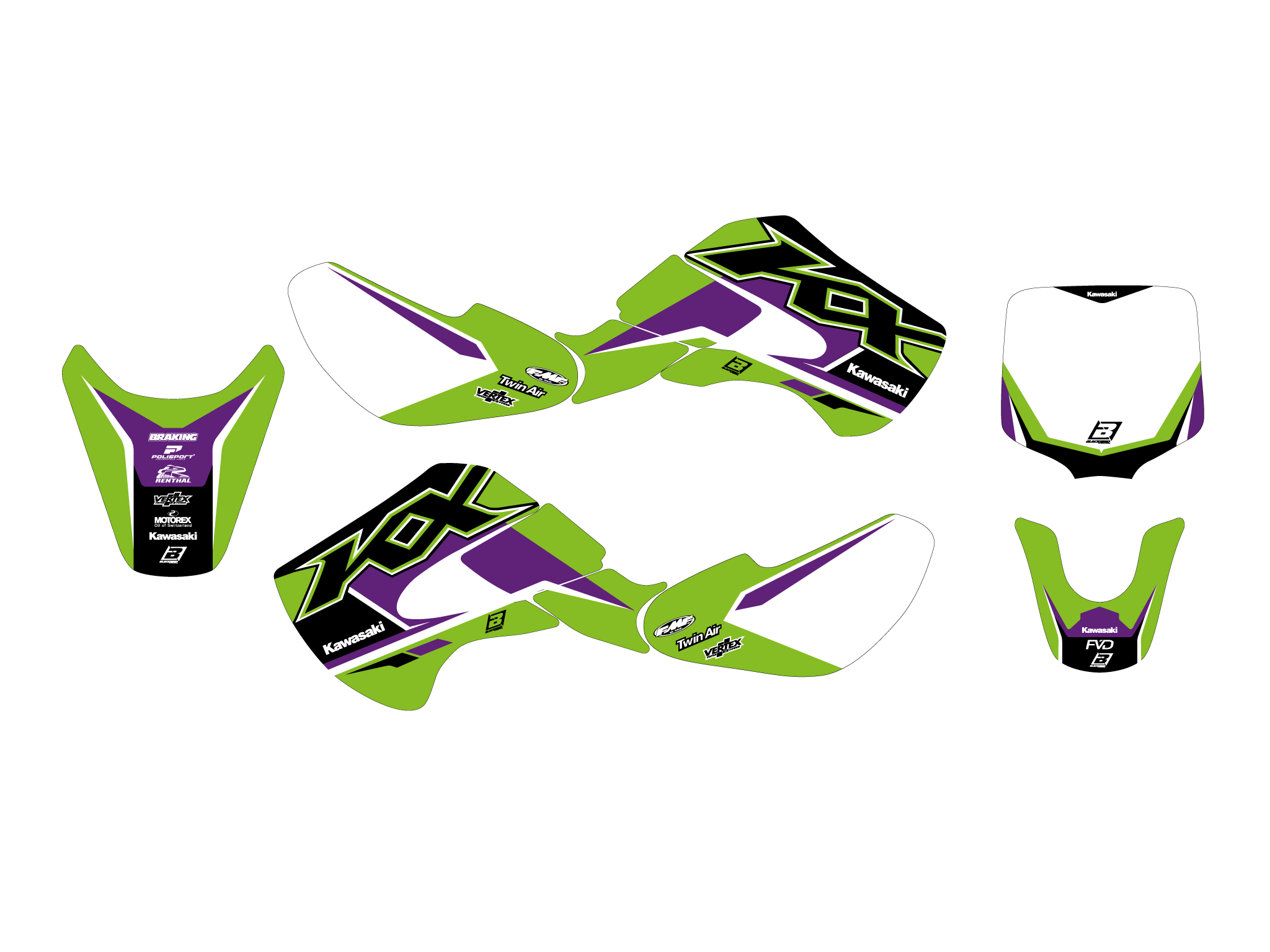 Le kit autocollants comprend : paire réservoir, paire ouïes de radiateur, garde-boue avant, garde-boue arrière, paire boîte à air et paire bras oscillant. Les différentes pièces qui composent le kit ne peuvent pas être vendues séparément. Les autocollants réservoir ont des trous pour permettre aux gaz d'essence de s'échapper. En cas de réservoirs usés, cela n'est pas toujours suffisant pour ne pas provoquer de légers décollements.