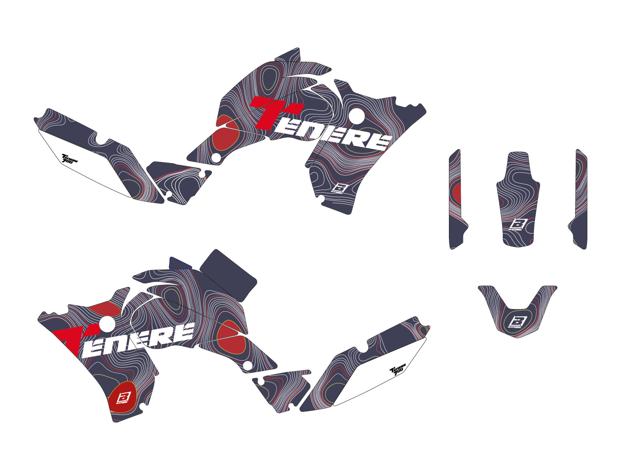 Il kit adesivi include: coppia convogliatori, coppia cassa filtro, coppia parasteli, coppia forcellone, parafango anteriore, parafango posteriore e tabelle portanumeri. I vari pezzi che compongono il kit non possono esser venduti separatamente.