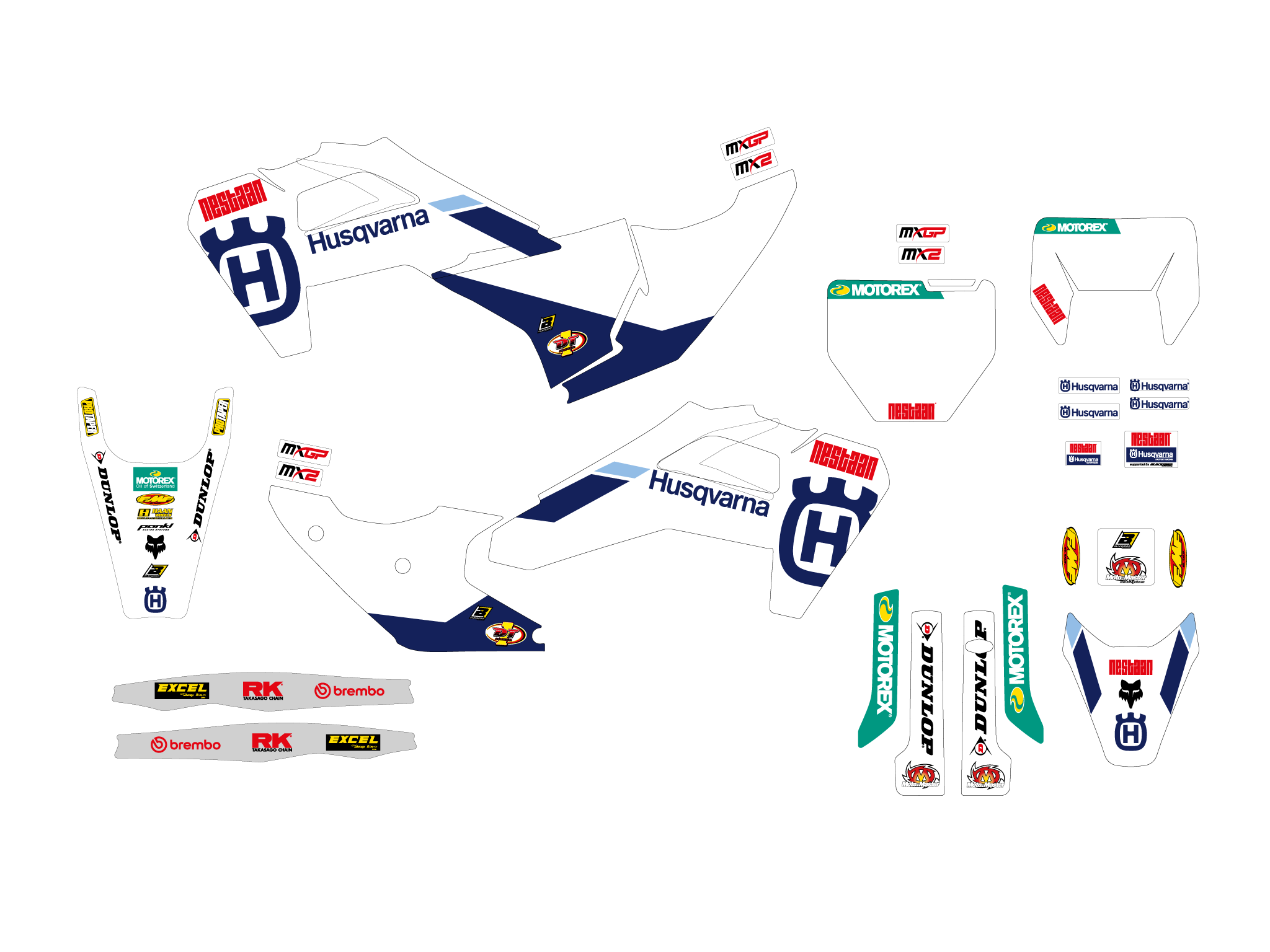 Ogni kit include tutte le parti principali: convogliatori, parafanghi, airbox, tabelle, forcellone.