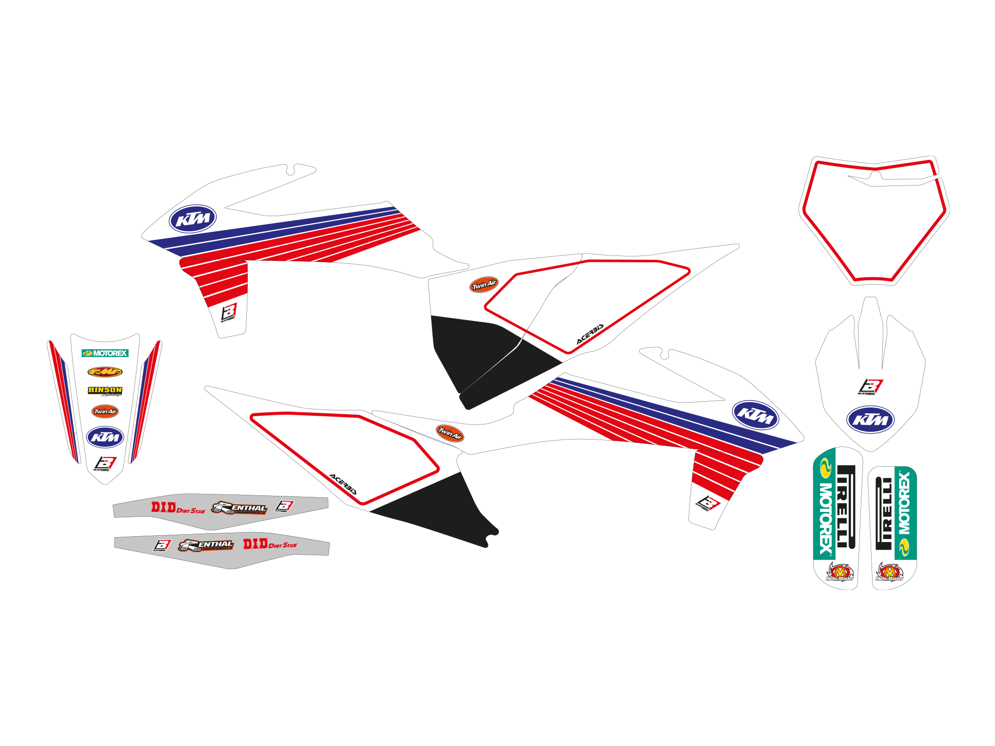 Ogni kit include tutte le parti principali: convogliatori, parafanghi, airbox, tabelle, forcellone.