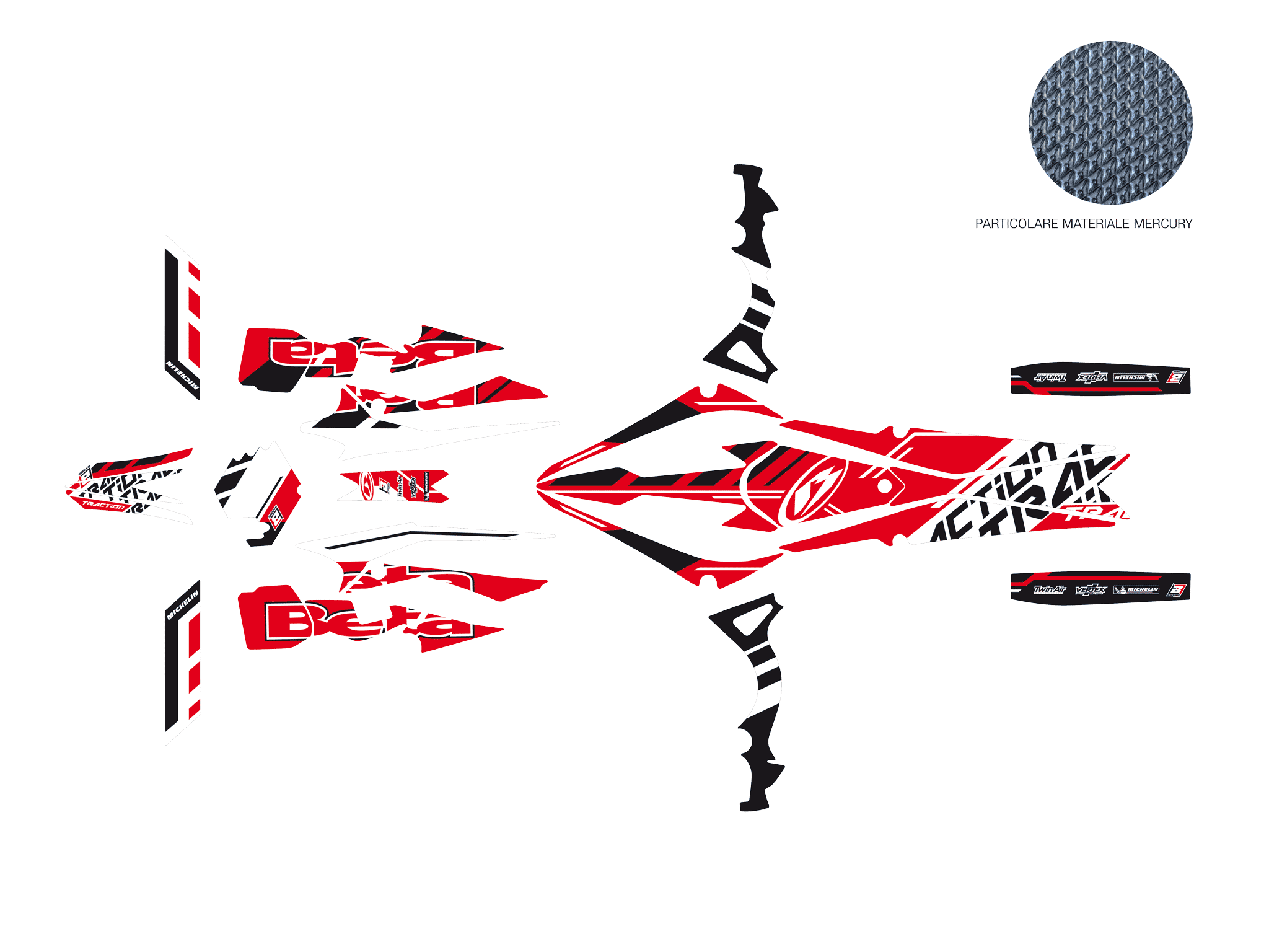 Il kit adesivi include: serbatotoio, parafango anteriore, parafango posteriore e forcellone. I vari pezzi che compongono il kit non possono esser venduti separatamente. La finitura del materiale è in Texture ruvido.