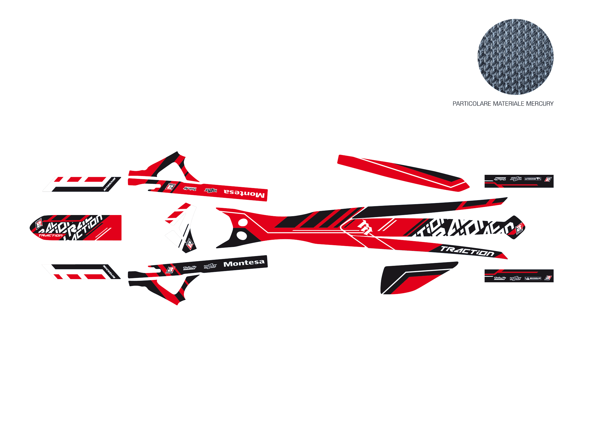 Il kit adesivi include: serbatotoio, parafango anteriore, parafango posteriore e forcellone. I vari pezzi che compongono il kit non possono esser venduti separatamente. La finitura del materiale è in Texture ruvido.