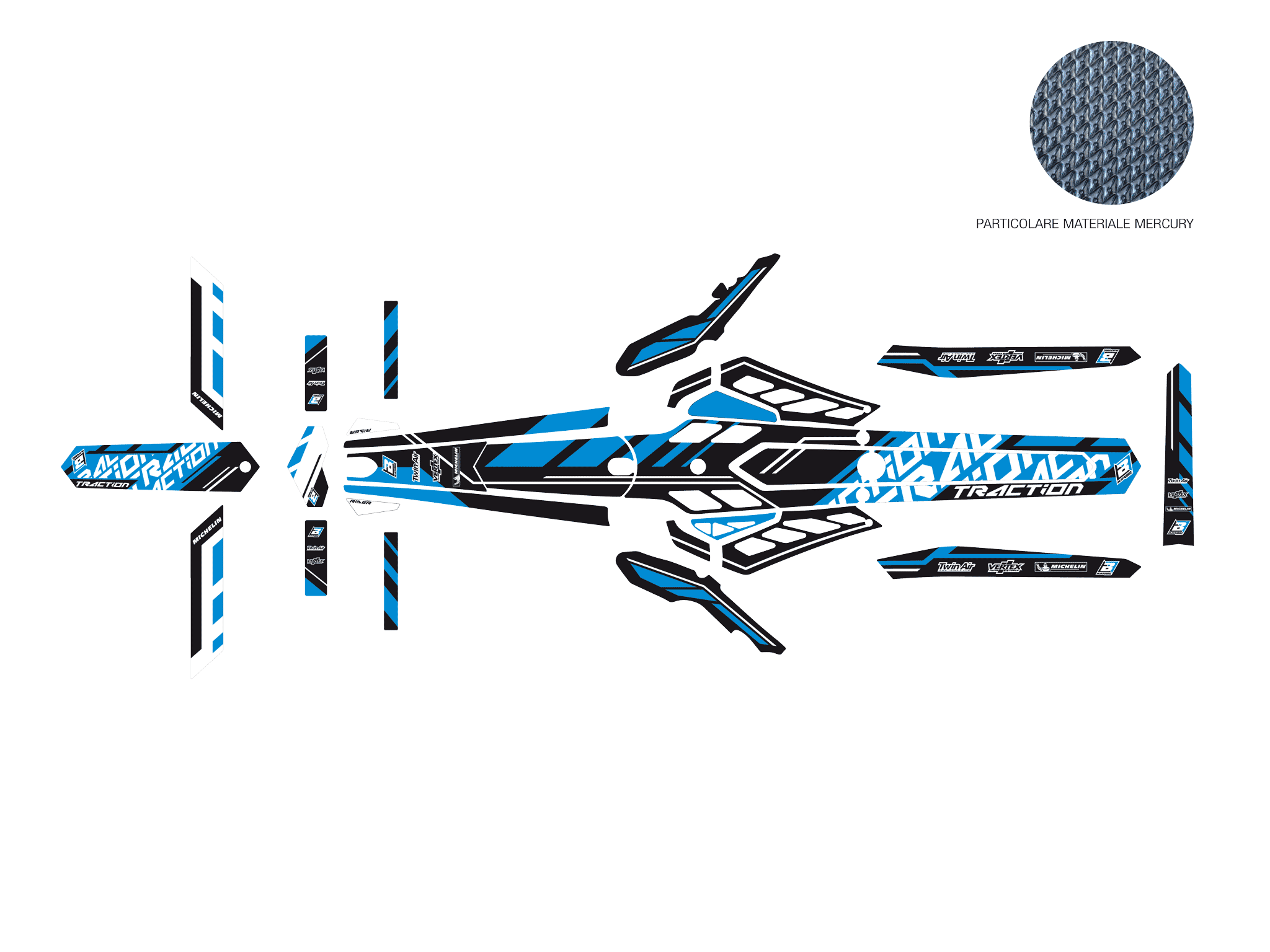 Il kit adesivi include: serbatotoio, parafango anteriore, parafango posteriore e forcellone. I vari pezzi che compongono il kit non possono esser venduti separatamente. La finitura del materiale è in Texture ruvido.